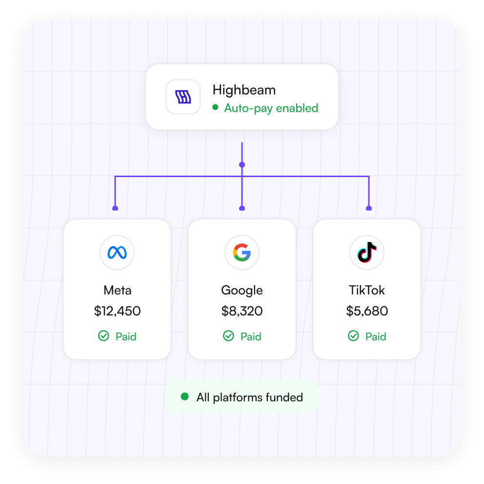 Highbeam connects directly to your ad accounts and handles payments automatically.No failed charges, no juggling manual payments, no scrambling when invoices hit.